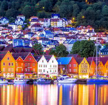 Bergen es una ciudad en la costa suroeste de Noruega. Está rodeada de montañas y fiordos, incluido el fiordo de Sogn, el más largo y profundo del país. Bryggen tiene casas de madera coloridas en el antiguo embarcadero, que alguna vez fue un centro del imperio comercial de la Liga Hanseática. El funicular Fløibanen asciende a la montaña Fløyen, que tiene vistas panorámicas y senderos de excursionismo. La casa de Edvard Grieg es donde vivió el reconocido compositor.